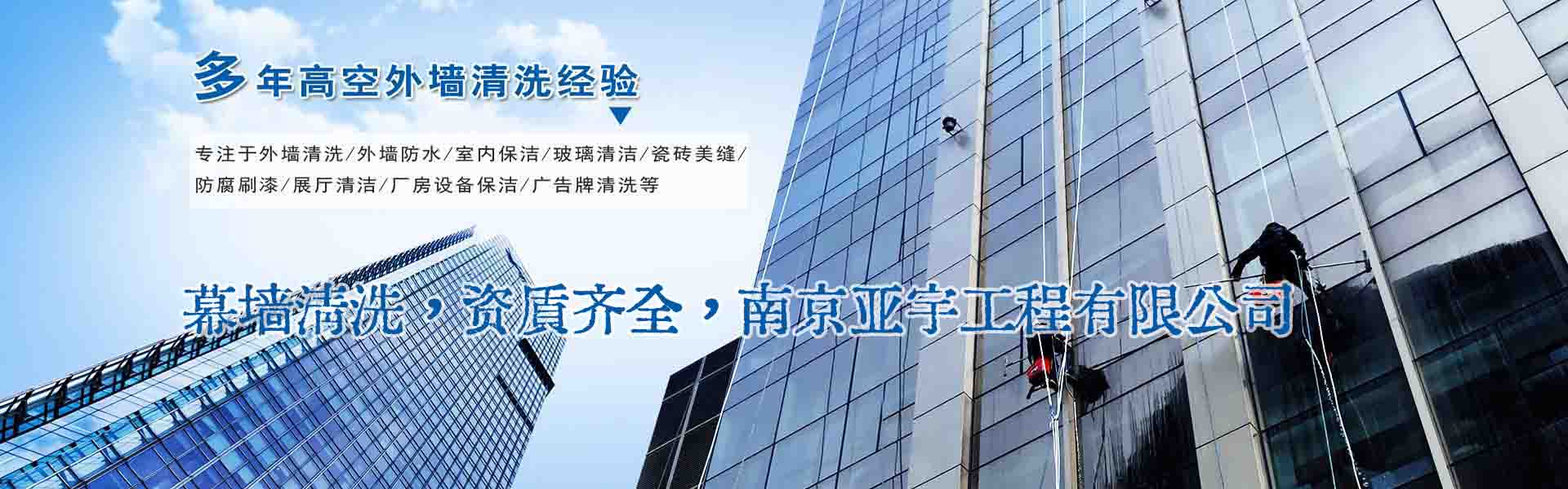 南京亞宇工程有限公司是專業提供:南京開荒保潔,南京外墻清洗,南京高空安裝,南京幕墻維修,外墻清洗、幕墻維修,防水防腐、外墻涂料翻新的南京工程公司。公司有著良好的培訓機制,每一位員工都經過嚴格的專業培訓,統一服裝、統一形象,提供給客戶專業優質的服務。現有各種作業車多輛、保潔設備數十臺,保潔員以及各類技術人數十人。公司現有管理部門多個,保證24小時急時、周到、安全、快捷的為您服務。 我們秉持“顧客...